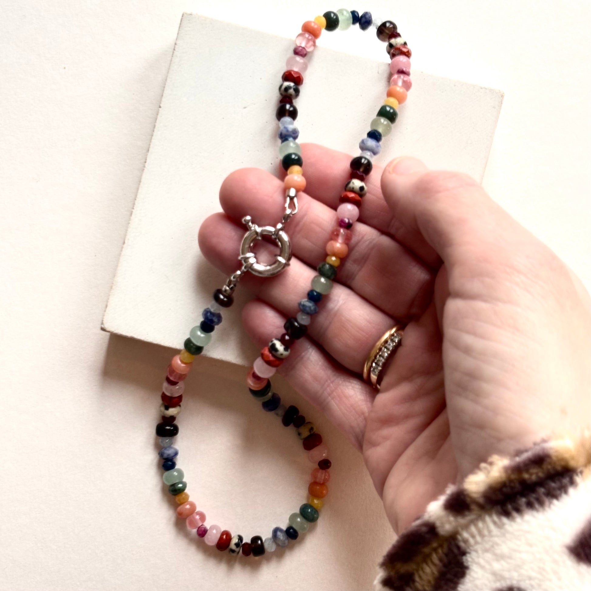 This necklace is made with Sodalite, aquamarine, Smokey Quartz, garnet, Dalmatian, red Jasper, rose Quartz, thurlite, peach moonstone, citrine, emerald, sapphire …. for happy vibes!